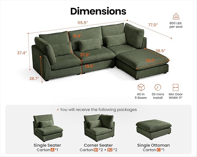 - 【Shipped in Six Packages for Easy Setup】To enhance your convenience, the sectional will be delivered in six packages, allowing for easier handling and assembly. Each package is carefully packed to ensure safety during transit, and while they may arrive at different days, rest assured that our professional customer service is ready to assist you with any concern. The thoughtful design makes the setup process simpler and more efficient,ensuring you enjoy your sectional without any hassle