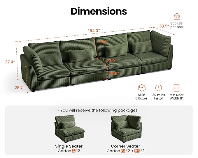 - 【Shipped in Six Packages for Easy Setup】To enhance your convenience, the sectional will be delivered in six packages, allowing for easier handling and assembly. Each package is carefully packed to ensure safety during transit, and while they may arrive at different days, rest assured that our professional customer service is ready to assist you with any concern. The thoughtful design makes the setup process simpler and more efficient,ensuring you enjoy your sectional without any hassle
