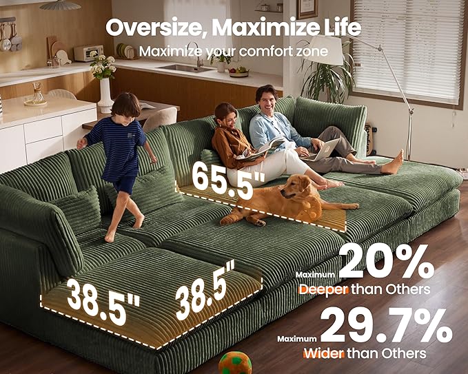 - 【Oversized Extra-Wide Deep Seating with Cloud-Like Comfy】Sink into expansive comfort with 27" deep seat—16.75~ 20% deeper than most sofas—and 38.5" wide seat—10~29.7% wider than typical couches. Stretch out freely with plenty of room to unwind. Featuring high-density foam, soft, skin-friendly corduroy and tightly woven chenille fabric. Relish in the perfect balance of plush softness and firm support. Whether focusing or relaxing, this sofa turns every moment into pure comfort