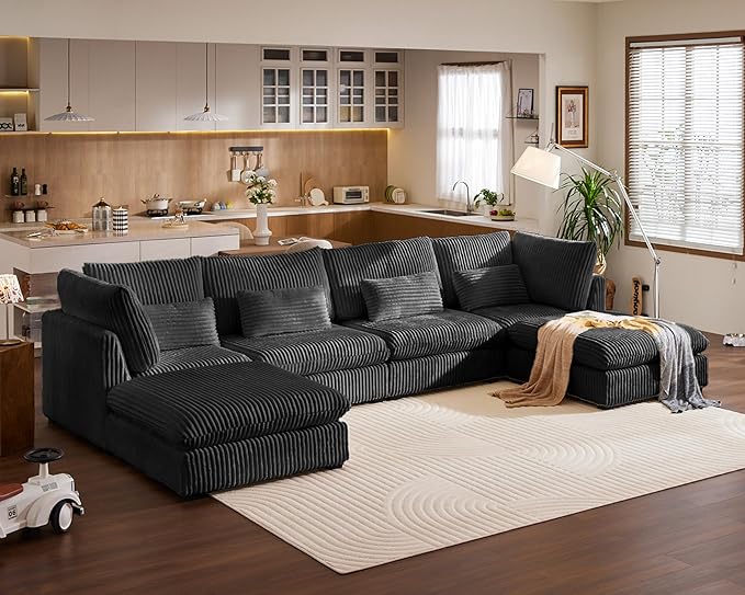 Oversized Modular Sofa, Extra Deep Cloud Corduroy Sectional Couch with Ottoman Chaise, Fluffy Chenille 6 Seat U-Shaped Sofa for Living Room, Villa (U Shape 6 Seater, Corduroy Black)