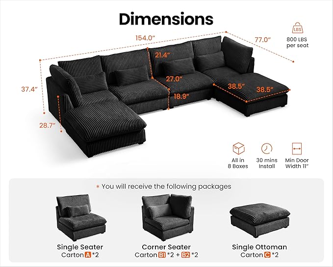 - 【Shipped in Eight Packages for Easy Setup】To enhance your convenience, the sectional will be delivered in eight packages, allowing for easier handling and assembly. Each package is carefully packed to ensure safety during transit, and while they may arrive at different days, rest assured that our professional customer service is ready to assist you with any concern. The thoughtful design makes the setup process simpler and more efficient,ensuring you enjoy your sectional without any hassle