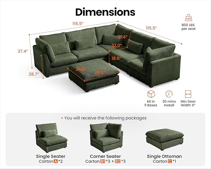 - 【Shipped in Nine Packages for Easy Setup】To enhance your convenience, the sectional will be delivered in nine packages, allowing for easier handling and assembly. Each package is carefully packed to ensure safety during transit, and while they may arrive at different days, rest assured that our professional customer service is ready to assist you with any concern. The thoughtful design makes the setup process simpler and more efficient,ensuring you enjoy your sectional without any hassle