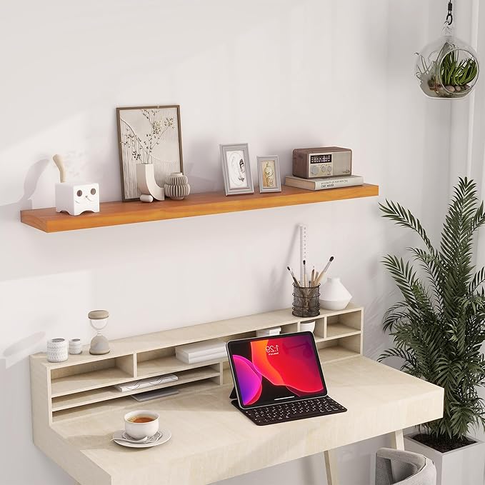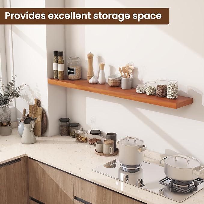 - Premium Wooden Floating Shelves -Unlike others, they are beautifully-finished, fantastic-smelling solid pine,and they are handcrafted out of finest solid pine wood measuring 48" x 8" x 1.38",revealing its own character of knots and natural wood grain, making each ledge a little different but equally stunning.