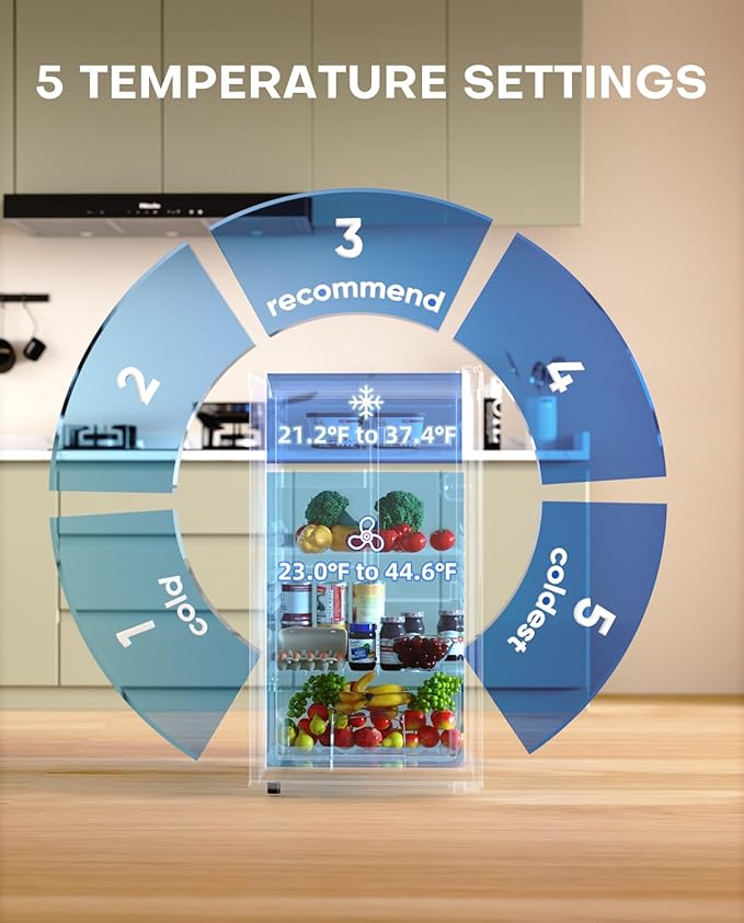 - Adjustable Temperatures: Ranges from 21.2°F to 44.6°F (not fit for storing ice cream), this 4.4 cu ft mini refrigerator offers 5 variable temperature settings. From crafting ice cubes to preserving food freshness, this mini fridge meets a variety of refrigeration demands