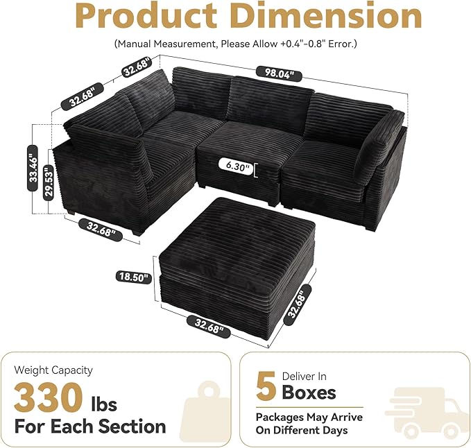 - One Package Per Seat:The modular sofa comes with 5 boxes and may arrive at different dates. Each box is designed and packaged to maximize shipping efficiency and fits narrow staircase and elevator. Armchair Size: 32.7" W x 28" D x 33.5" H; Ottoman Size: 32.7" W x 32.7" D x 18.5" H. Weight Capacity: 330 lbs / Seat. There may be slight color differences due to light or monitor.