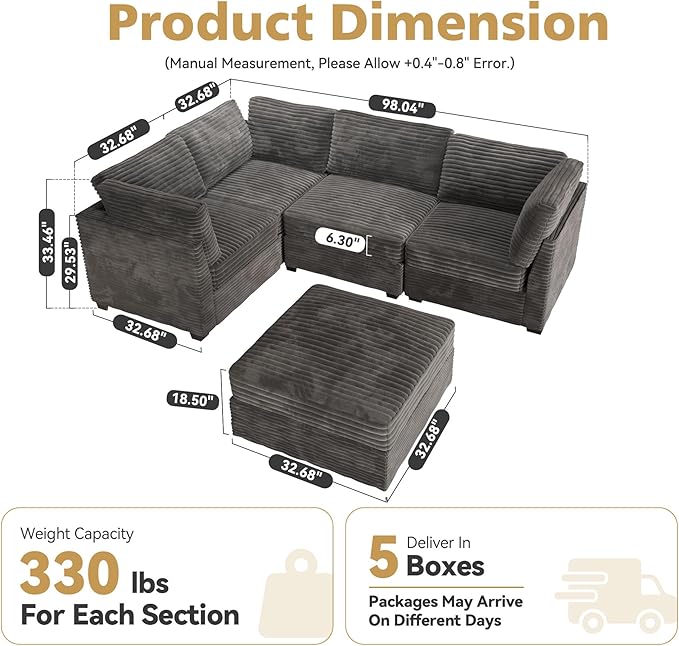- One Package Per Seat:The modular sofa comes with 5 boxes and may arrive at different dates. Each box is designed and packaged to maximize shipping efficiency and fits narrow staircase and elevator. Armchair Size: 32.7" W x 28" D x 33.5" H; Ottoman Size: 32.7" W x 32.7" D x 18.5" H. Weight Capacity: 330 lbs / Seat. There may be slight color differences due to light or monitor.