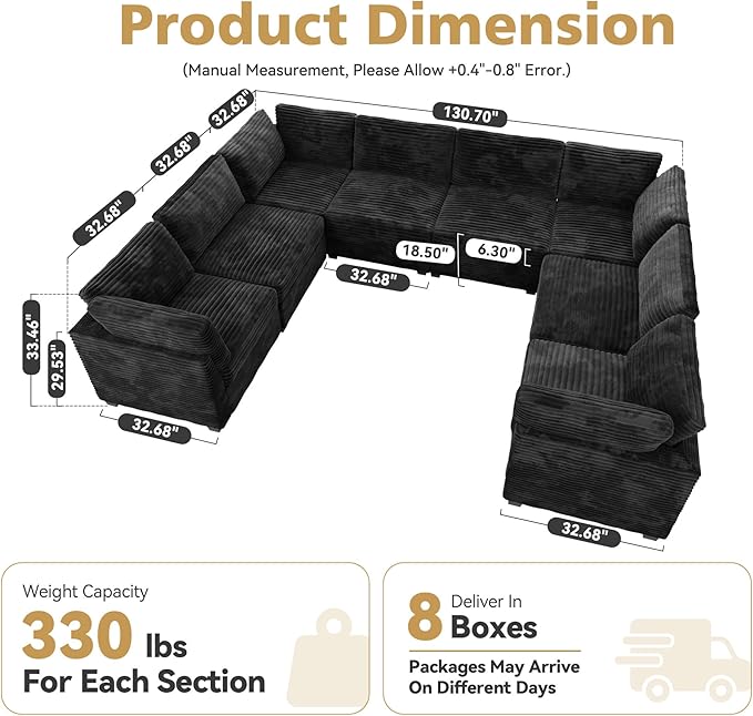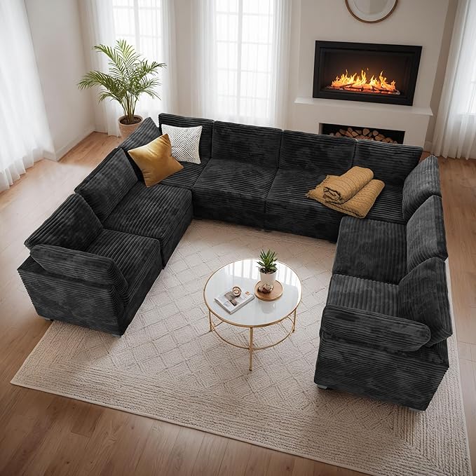 Modular Sectional Sofa with Chaise U Shaped Sectional Couch for Living Room, 8-Seater Comfy Cloud Couches, Plush Corduroy, Black