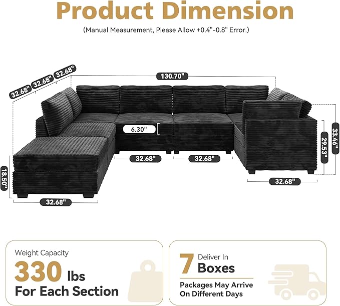 - One Package Per Seat:The modular sofa comes with 7 boxes and may arrive at different dates. Each box is designed and packaged to maximize shipping efficiency and fits narrow staircase and elevator. Armchair Size: 32.7" W x 28" D x 33.5" H; Ottoman Size: 32.7" W x 32.7" D x 18.5" H. Weight Capacity: 330 lbs / Seat. There may be slight color differences due to light or monitor.