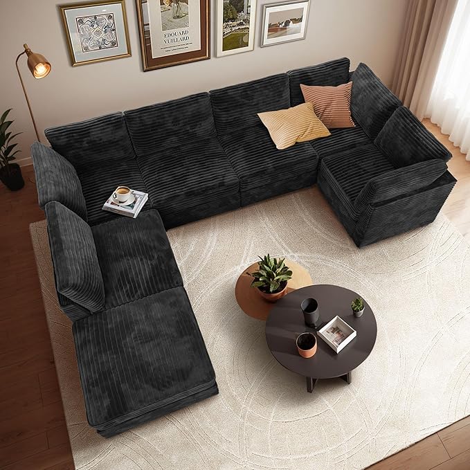 Modular Sectional Sofa with Chaise U Shaped Sectional Couch for Living Room, 7-Seater Comfy Cloud Couches with One Movable Ottoman, Plush Corduroy, Black