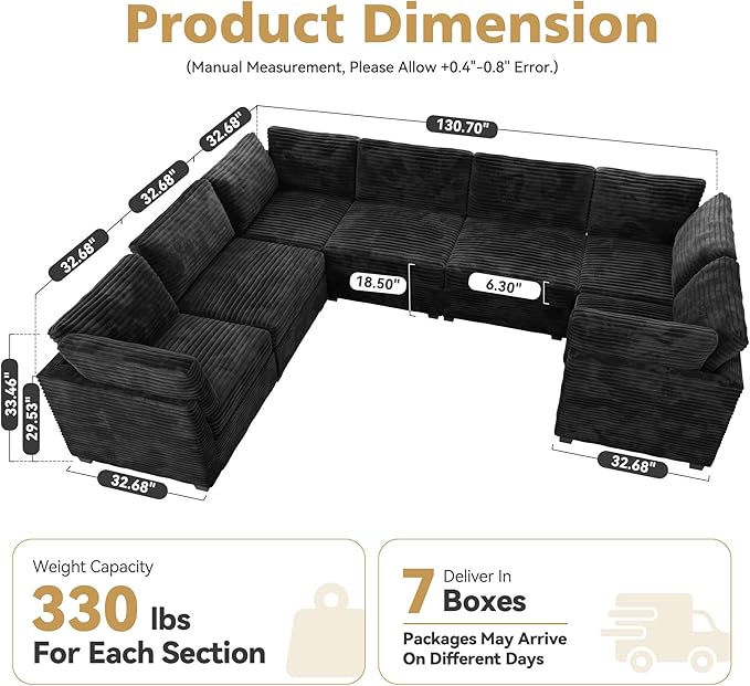 - One Package Per Seat:The modular sofa comes with 7 boxes and may arrive at different dates. Each box is designed and packaged to maximize shipping efficiency and fits narrow staircase and elevator. Armchair Size: 32.7" W x 28" D x 33.5" H; Ottoman Size: 32.7" W x 32.7" D x 18.5" H. Weight Capacity: 330 lbs / Seat. There may be slight color differences due to light or monitor.