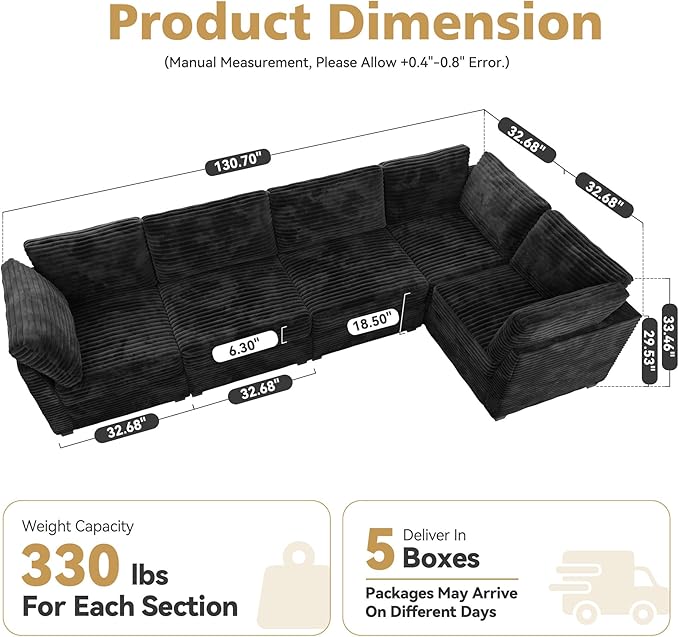 - One Package Per Seat:The modular sofa comes with 5 boxes and may arrive at different dates. Each box is designed and packaged to maximize shipping efficiency and fits narrow staircase and elevator. Armchair Size: 32.7" W x 28" D x 33.5" H; Ottoman Size: 32.7" W x 32.7" D x 18.5" H. Weight Capacity: 330 lbs / Seat. There may be slight color differences due to light or monitor.