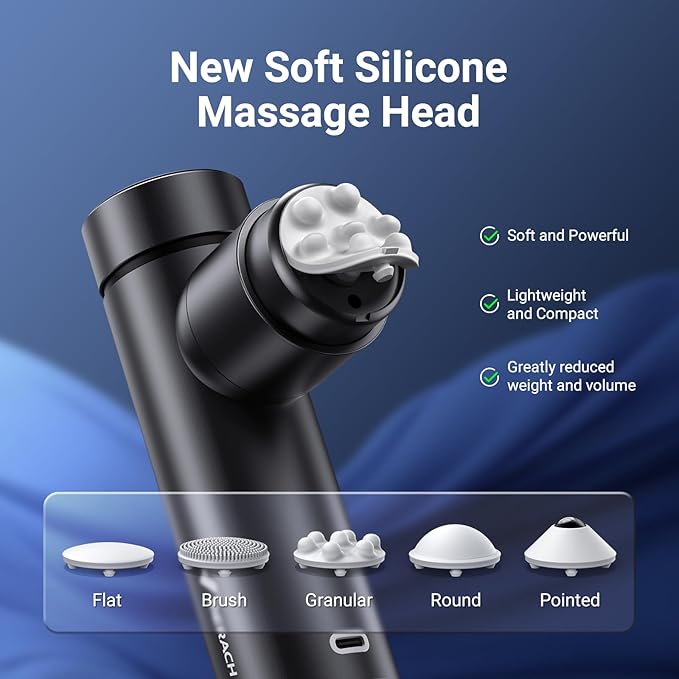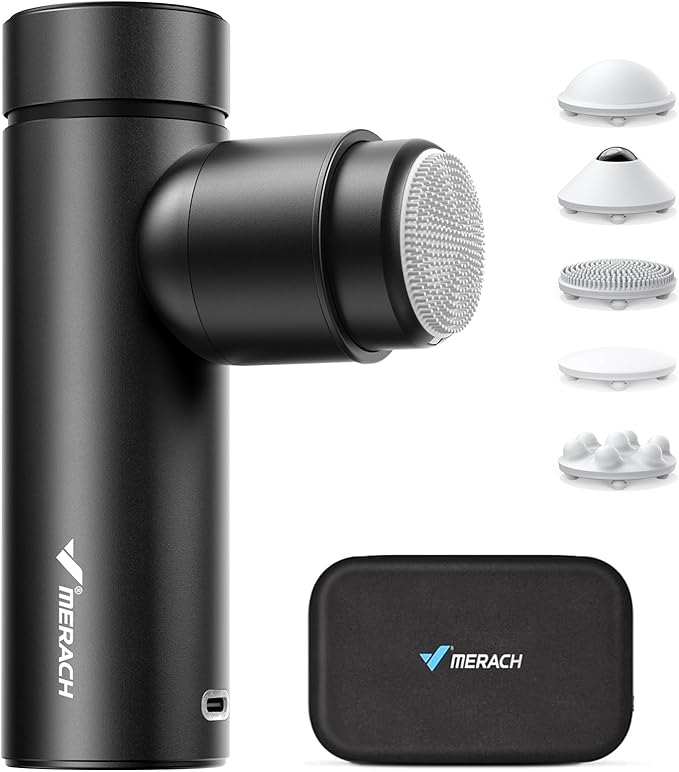 - [Newly Designed Massage Gun] MERACH has redefined the massager gun. MERACH M022 Mini Massage Gun is more mechanical thanks to the high-strength aluminum alloy shell and a transparent cover on the top. This massager abandons the traditional massage head and adopts new 5 silicone mini massage head, which are more convenient to carry, replace and clean. Widely used on the shoulder and neck, back, legs, soles, and other parts.