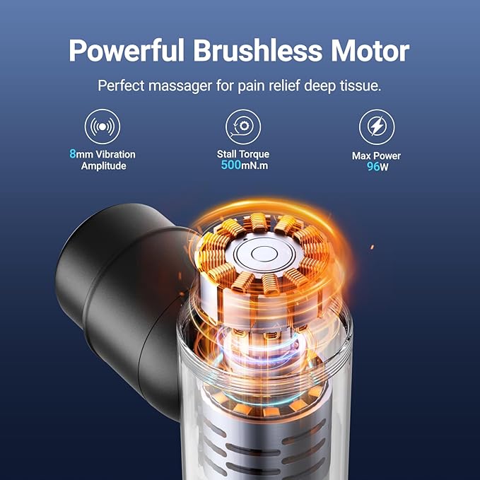 - [Powerful Brushless Motor] With the upgraded structure and powerful brushless motor, the vibration amplitude of this percussion massage gun is up to 8mm. The 3 power modes provide an impact force of 26.5-30.8lbs, meet the needs of muscle relaxation whether pain relief after exercise or daily body massage. In addition, M022 massager is a perfect muscle massager for pain relief deep tissue since the Max 96W power and Stall Torque 500mN.m.