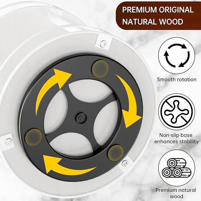- 1. Stay Organized in Style: Ditch clutter and stay organized with our two-tier turntable Lazy Susan! This beautiful wooden rotating spice rack spinner is perfect for any table top, farmhouse bathroom decor, round decorative tray for your vanity, counter, sink, coffee table, and much more