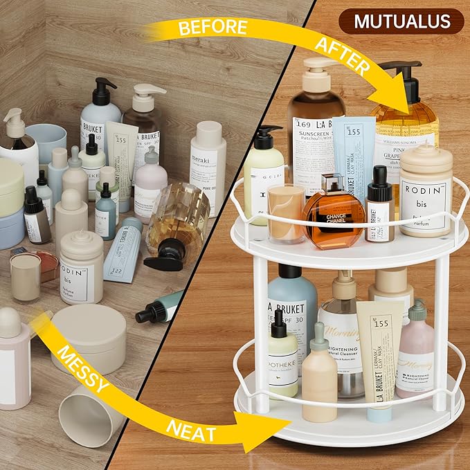 - 2. Efficient Design for Easy Access: Whether you're grabbing your favorite spices or toiletries, our Lazy Susan organizer makes it easy. The two-tier design allows for efficient storage, while the rotating design ensures easy access to all your items