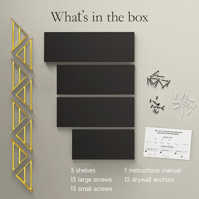 - **Three different size Floating Shelves for All** : Large: 16.5 × 5.5 × 4.6 inches; Medium: 14.2 × 5.5 × 4.6 inches; Small: 11.4 × 5.5 × 4.6 inches. These floating shelves are wider and sturdier than others to safely hold collectibles, photos, small plants and showcase favorite dishes or build your own coffee bar. Easy to assemble with all necessary hardware included according to the instruction steps.