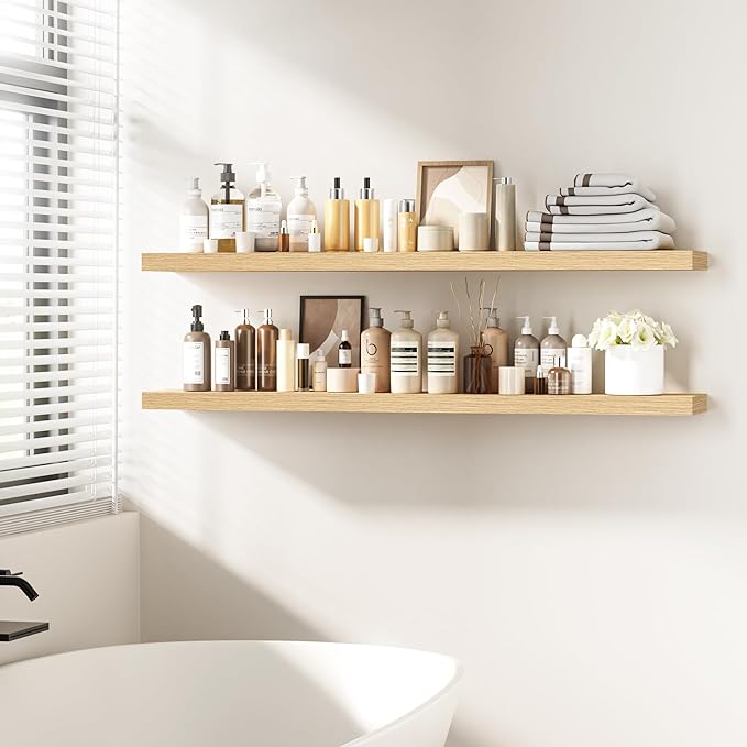 - Versatile & Multi-Scene Functionality: Our floating shelves are available in a variety of sizes and thicknesses, allowing you to choose the perfect fit for your space. Use them in the bathroom to store beauty products, hair care items. In the bedroom, they can hold books, cosmetics, and personal items. In the kitchen, they’re perfect for spices, jars, or small utensils. Or display photo frames, trophies, or collections in the living room. These shelves efficiently use wall space to create a tidier, more spacious feel in any room.