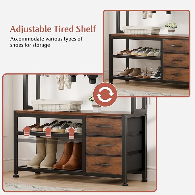 - Upgrade 6-in-1: The Entryway Shoe Bench Coat Stand combines to 12 hooks(7 hook accessories), 3 drawers, a storage shelf, a clothing rail, a shoe rack and a shoe bench holding 200lb to keep your entryway organized and functional. Moreover, our coat rack with shoe storage creates a concise and casual style.
