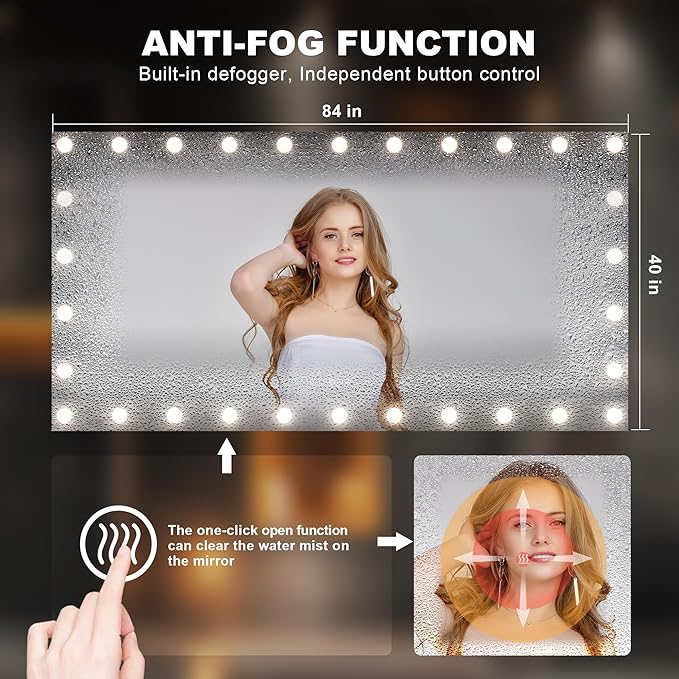 - 【Upgraded Anti-Fog & Smart Touch Screen】 Our bathroom mirror features an enhanced anti-fog function with a large heating film for faster fog removal, ensuring a clear reflection after your shower. The smart touch screen allows easy control of lights, color modes, and brightness, offering a sleek and convenient experience.