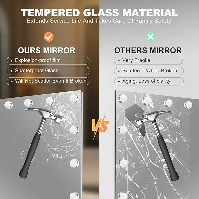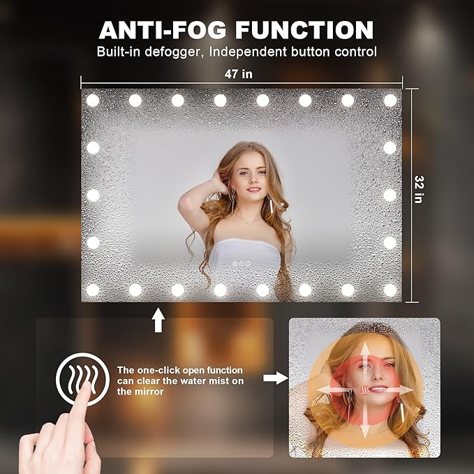 - 【Hollywood Design with Full Illumination】This modern bathroom mirror features a 47" x 32" HD glass mirror with a Hollywood-style design and 22 LED bulbs, delivering even, shadow-free lighting. Its frameless design and elegant Hollywood aesthetic bring style and functionality to any luxurious bathroom décor.
