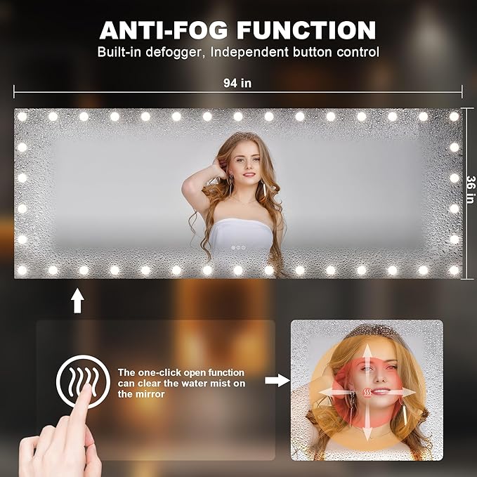 - 【Upgraded Anti-Fog & Smart Touch Screen】 Our bathroom mirror features an enhanced anti-fog function with a large heating film for faster fog removal, ensuring a clear reflection after your shower. The smart touch screen allows easy control of lights, color modes, and brightness, offering a sleek and convenient experience.