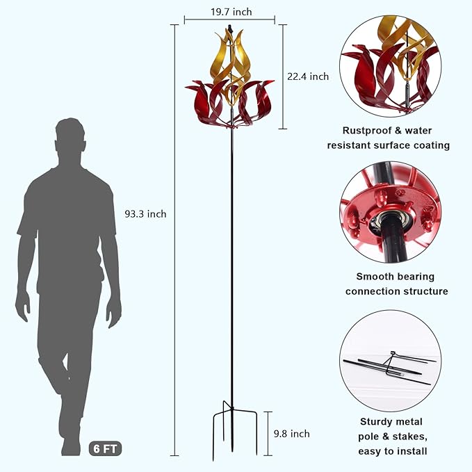 - ☁️【ALL-WEATHER ENJOYMENT】Made from high-quality metal with weather-resistant finishes, our outdoor wind spinner is built to withstand rain, snow, and harsh sun without fading or rusting. Designed with ease of use in mind, the wind spinner is simple to assemble, enjoy its charm season after season.