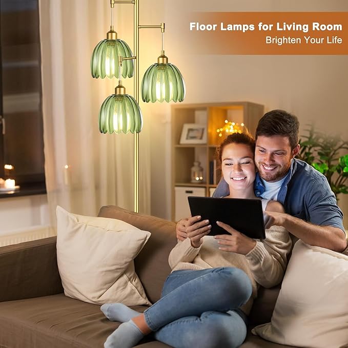 Gold Floor Lamp for Living Room,Bedroom,Mid Century Modern Standing Lamp Brass Tree 3 Light Tall Floor Lamps Vintage Retro Floor Lights Glass Green Flower Lamp Shade Farmhouse Boho Bohemian