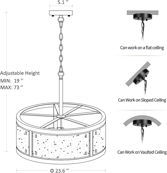 - Adjustable Height: Diameter: 23.6 in, Height: 19-73 in, Canopy Diameter: 5.1 in. Flat,sloped and vaulted ceilingsare compatible. Easily customize the height of this large black chandelier according to your preferences.