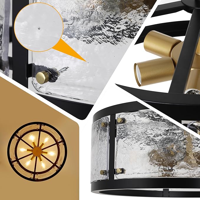 - Design: Large drum chandelier is meticulously crafted by highly skilled craftsmen. The black metal frame is combined with clear waterglass to create a unique texture and depth. Gold accents add a touch of luxury, while the overall circular design provides an even and welcoming lighting effect. The clear waterglass will produce a unique light and shadow effect when the light penetrates, adding a unique charm to the interior.