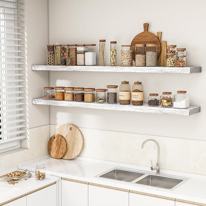 - 72 Inch Floating Shelves for Wall (Set of 2): Each wall shelves are 8 inches in depth and 1.5 inches in thickness. 2-piece set is more cost-effective and practical. Our wall shelf can be used in combination, staggered high or low on the wall, or mounted side-by-side to provide extra storage space for organizing small items and clutter in multiple areas such as kitchens, bathrooms, and bedrooms, creating a clean and smooth look. Multiple colors available