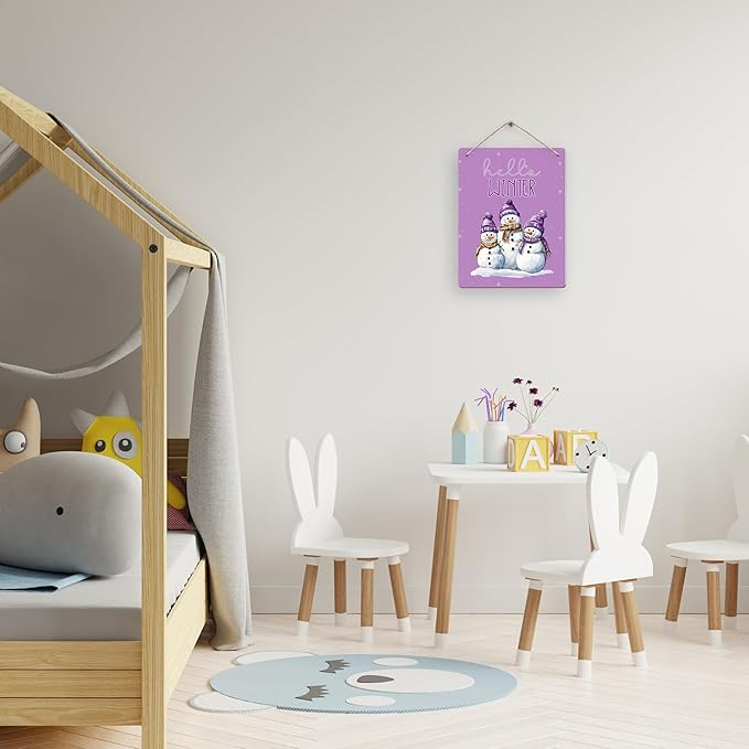 Purple Hello Winter Snowman Hanging Wooden Signs 10x8, Snowman Winter Signs, Winter Door Sign, Purple Snowman Winter Snowflakes Home Room Office Hanging Wall Decor
