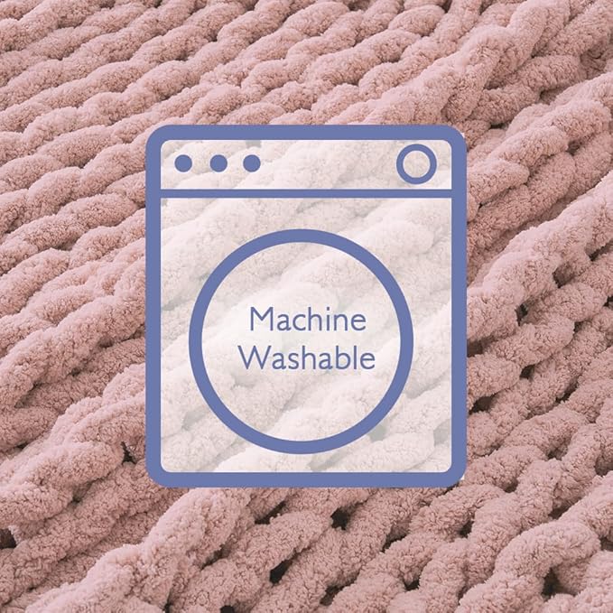Bigacogo Chunky Knit Throw Blanket for Couch, 60x80 inches, 100% Hand Knitted with Thick Jumbo Chenille Yarn, Cozy Soft Large Rope Knot Cable Crochet Blankets for Sofa Bed Living Room, Dusty Pink