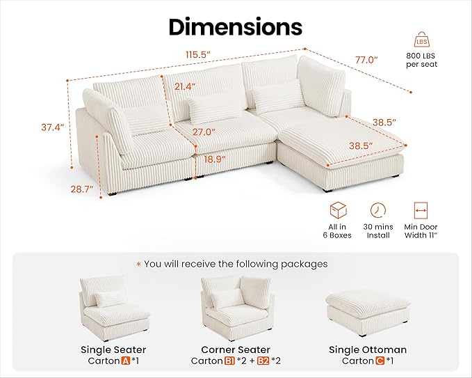 - 【Shipped in Six Packages for Easy Setup】To enhance your convenience, the sectional will be delivered in six packages, allowing for easier handling and assembly. Each package is carefully packed to ensure safety during transit, and while they may arrive at different days, rest assured that our professional customer service is ready to assist you with any concern. The thoughtful design makes the setup process simpler and more efficient,ensuring you enjoy your sectional without any hassle