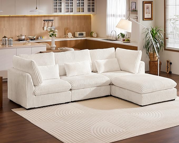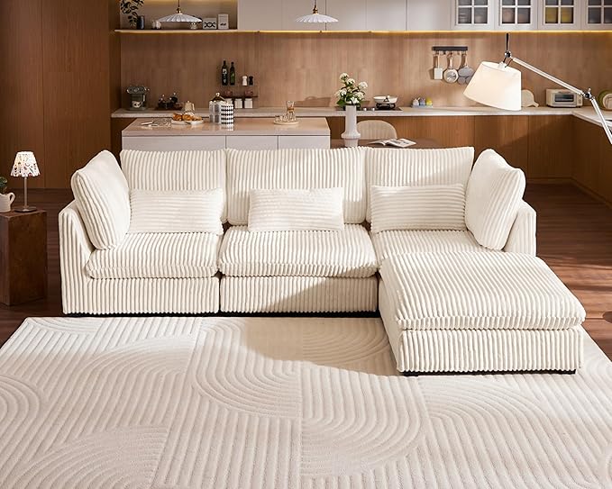 Oversized Modular Sofa, Extra Deep Cloud Corduroy Sectional Couch with Ottoman Chaise, Fluffy Chenille 4 Seat L-Shaped Sofa for Living Room, Villa (L Shape 4 Seater, Corduroy White)