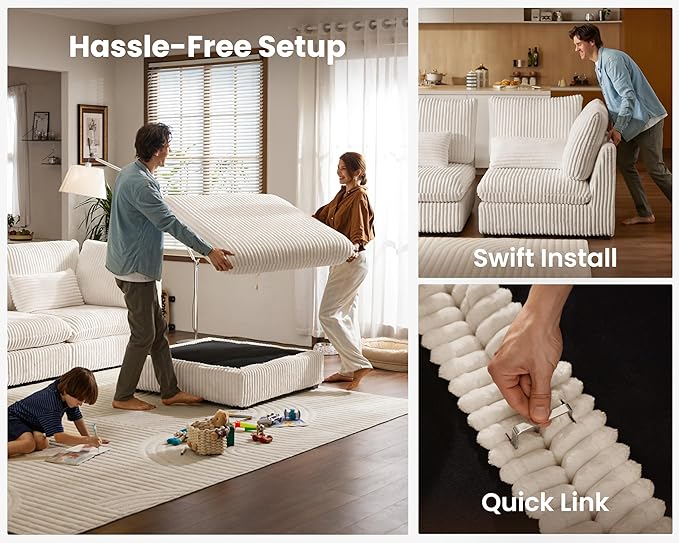 - 【Tool-Free Assembly in Minutes】Assemble your sofa in no time—no tools required! The modular design allows for quick and easy setup using high-quality U-shaped stainless steel connectors, ensuring a secure fit between each module. Reconfigure your sectional effortlessly and enjoy it in as little as 20 minutes. Perfect for those who value convenience and flexibility, this sectional offers a seamless assembly experience and provides total comfort from the moment it arrives