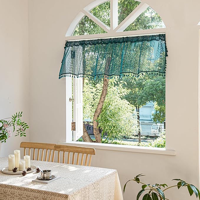 Sutuo Home Boho Valance Tier Curtains Crochet Lace Sheer Bohemian Hollow Knitted with Tassels, Privacy Vintage Rustic Farmhouse Drapes for Kitchen, Rod Pocket 1 Panel 59" W x 36" L, Turquoise