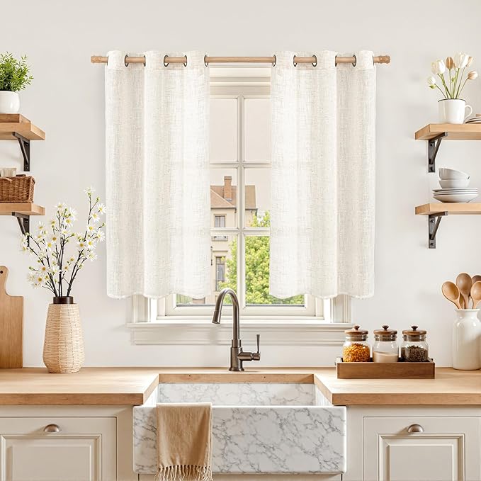 LAMIT Short Sheer Linen Curtains 40 inches Long, Bronze Grommet Linen Drapes Light Filtering Semi Sheer Curtains for Small Window/Kitchen/Farmhouse, 2 Panels (34 x 40 Inch, Cream)