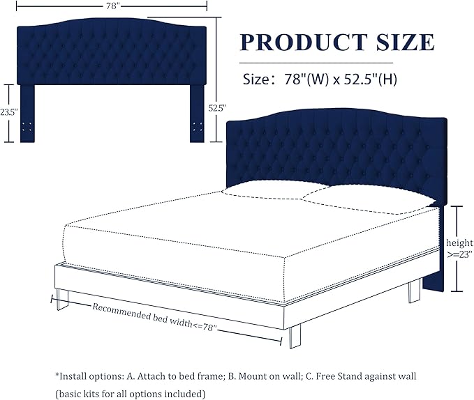 Velvet Upholstered Headboard King/Cal King Size Latest Model Wall Mount, Bed Frame Mount, Featuring High-Density Sponge Padding, Luxury Texture Easy Assembly Comfort and Style-Navy Blue