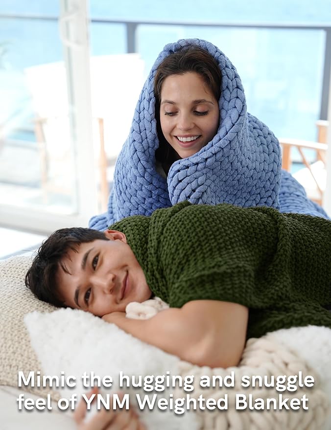 - [Style Meets Function] In order to mimic the hugging and snuggle feel of YNM Weighted Blanket, medium weight chunky yarn is chosen to hand knit this thick blanket(50x60 weighs 4.4lb, 60x80 weighs 7.3lb, 80x87 weighs 10.5lb). This thick chunky yarn not only provide soothing and relaxation feel, but also add texture to your blanket. Wrap around you on the sofa, layer the chunky knit blanket under your duvet or quilt to add warmth, or drape across your bed as a textural throw.