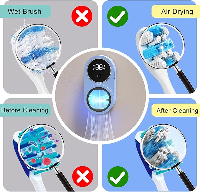 - Keep Your Toothbrush Clean - Our smart toothbrush holder offers efficient, scientific toothbrush light cleaning and fan drying technology and recirculation purification. Its automatic cleaning cycle effectively cleans the toothbrush and the fan is noiseless during the drying process, say goodbye to oral problems and embrace a clean toothbrush with our technology