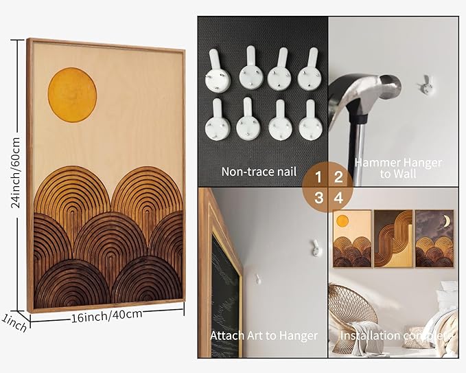 Tinonedraw Boho Mountain Framed Canvas Wall Art Set, Mid Century Modern Geometric Line Wall Decor, Bohemian Sun and Moon Art Paintings, Beige Brown Wooden Artwork for Living Room Bedroom Office 16"x24"x3
