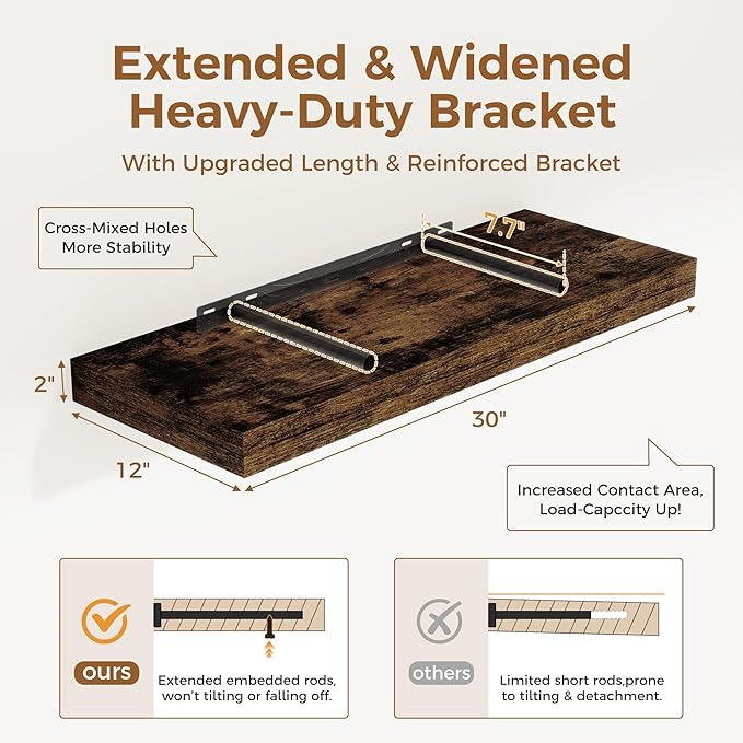 - 【FARMHOUSE RUSTIC WALL SHELF】These floating shelves are made of premium engineered wood board and invisible one-piece bracket. The rustic wooden grain surface add character and warmth to any modern or traditional interior with these thick floating shelves, contrast shelves at staggering heights on the wall or mount side-by-side or in the corner for a clean streamlined look.