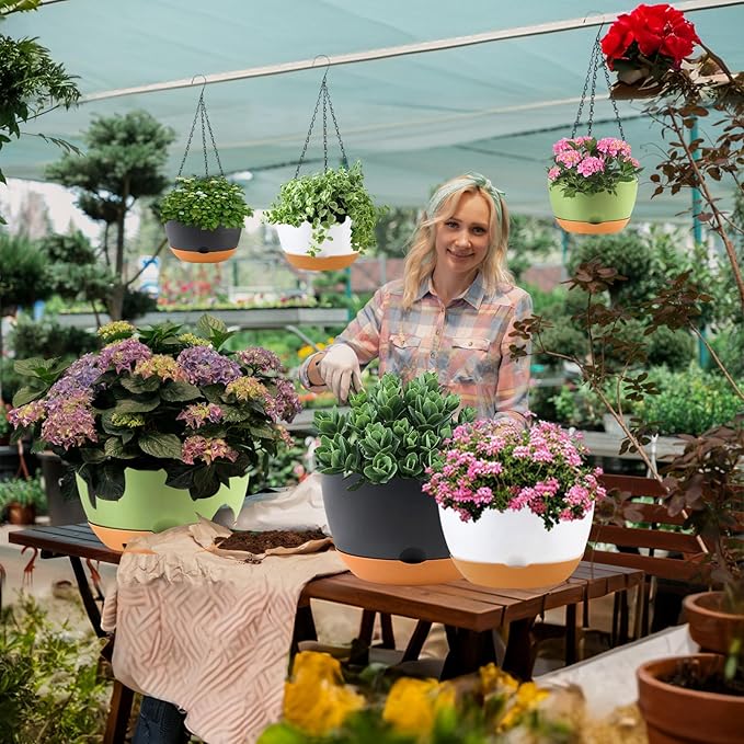 - 【Ventilation and Drainage】The bottom of the planter has a porous design for proper ventilation and drainage. for effective drainage and ventilation. This, combined with the mesh-like structure at the base of the 10 inch self-watering hanging pots, ensures optimal aeration. Suitable for plastic hanging baskets for plants, this design promotes well plant respiration.