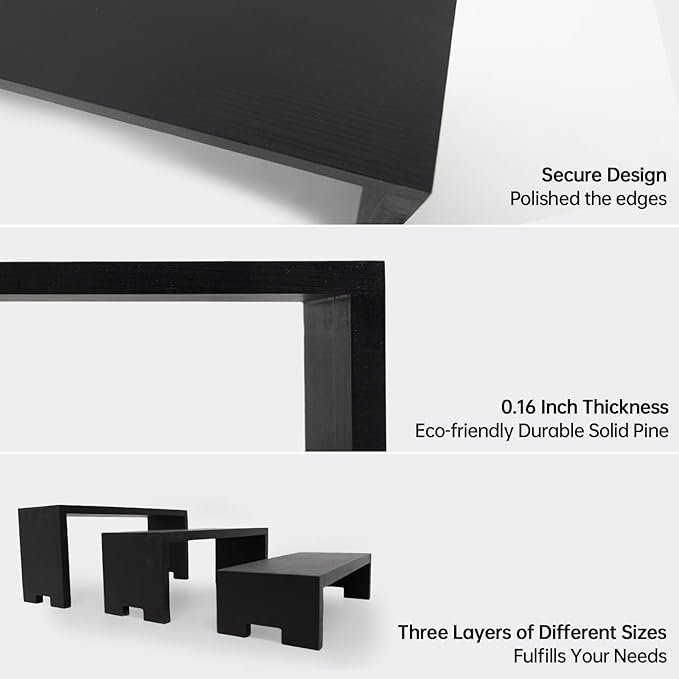 - 【Tierd Display Stands for Vendor】🎁: First they are no need any tools then can be used directly! very convenient to display more items for vendors, they are not only beatiful but also improve space utilization rate, U-shaped wood risers, fire-carbonized, durable, non-toxic, odorless, and no deformation, nested design for easy storage in living room,bedroom,kitchen,indoor,outdoor, also can be used individually or as a set.