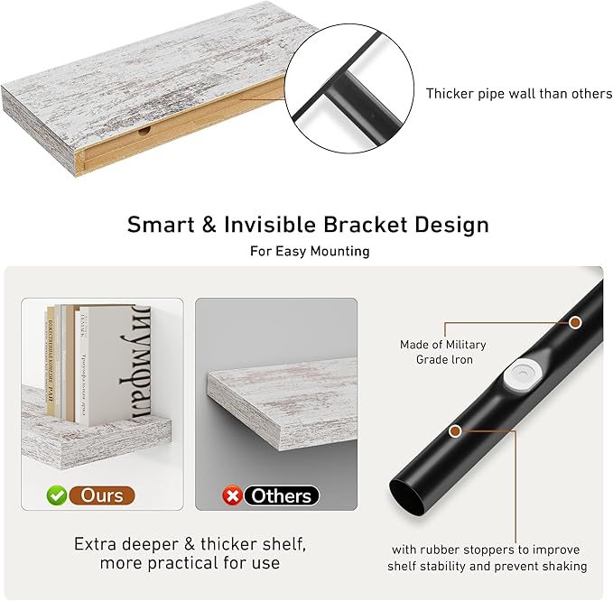 - Multi-scene & Functional - Mount in the bathroom perfect storage of beauty, hair products or aromatherapy. Mount in the bedroom to hold your books, cosmetics and personal privacy things. Mount in the kitchen to hold spices and jars. Or as a display shelf mount in the living room to show your picture frames, trophies or favorite collection. The rustic shelves can help make full use of the empty wall, which is much more space-saving and makes your room look larger and tidier.