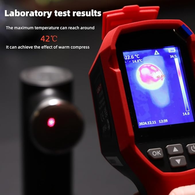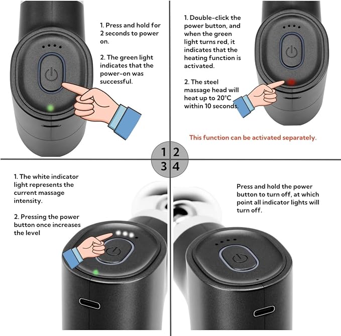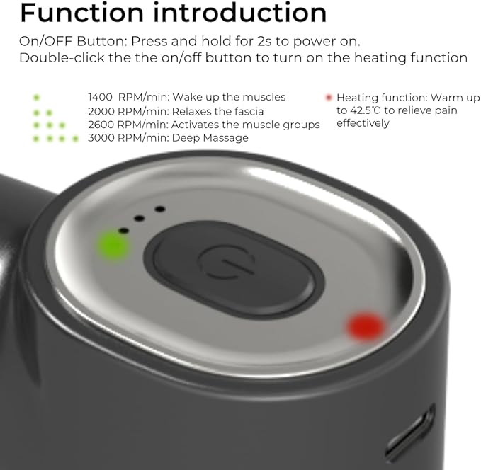 - 【Effective Rapid-Heat Massage Gun】 Equipped with a unique heat-conductive steel head, this deep tissue massage gun achieves 46°C/114°F in only 1 minute for enhanced relief from muscle tension and soreness. Operation: Enable heating by double-pressing the Power button (indicated by a red light). Do not use the silicone massage head when using the heating function.
