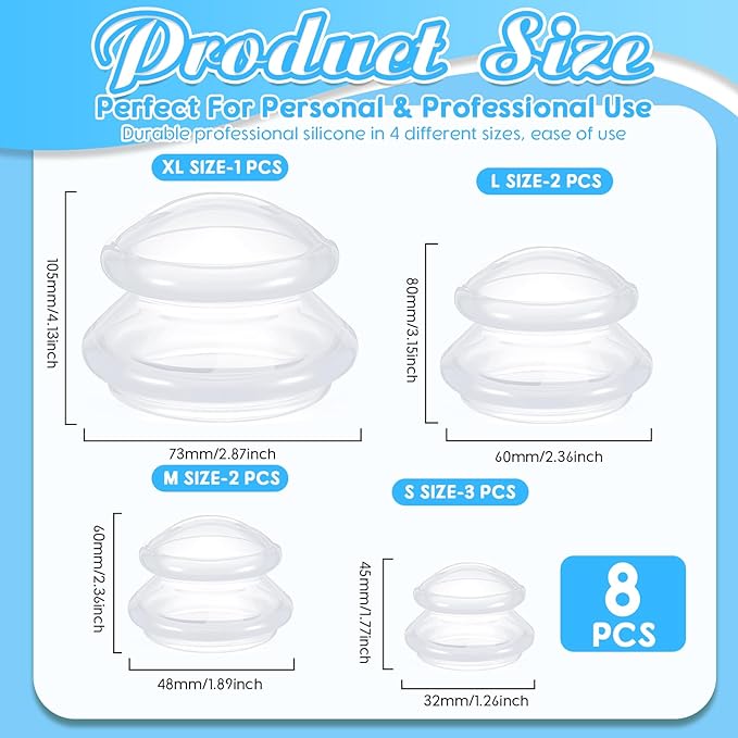 - Different Sizes and Multiple Uses: this silicone cupping set is available in a range of sizes to meet your requirements; Extra large cups are 105*73mm/4.13*2.87inch, large cups are 80*60mm/3.15*2.36inch, medium cups are 60*48mm/2.36*1.89inch, and tiny cups are 45*32mm/1.77*1.26inch; This massage cupping set can help you with hurting body ache, whether it's in your shoulders, back, waist, arms, or legs