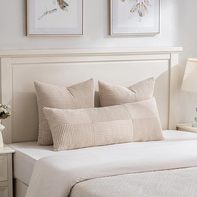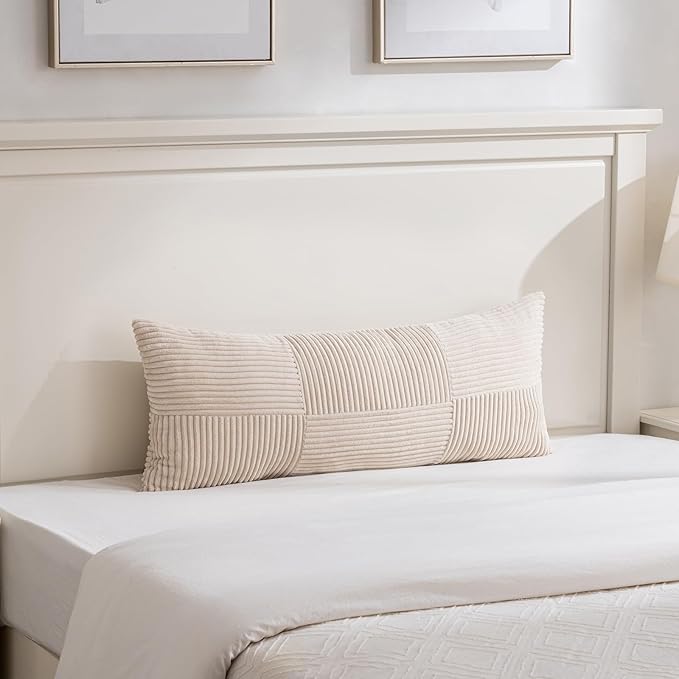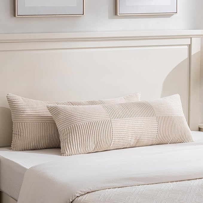 Fancy Homi Set of 2 Tan Boho Long Lumbar Body Decorative Throw Pillow Cover 14x36 Inch for Bed Couch Bedroom Bench, Soft Patchwork Corduroy Textured Pillow Case, Rustic Farmhouse Room Décor