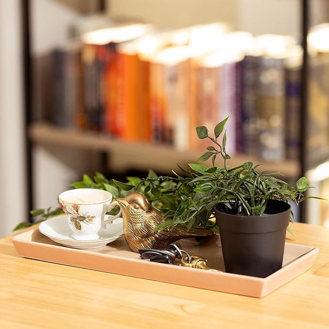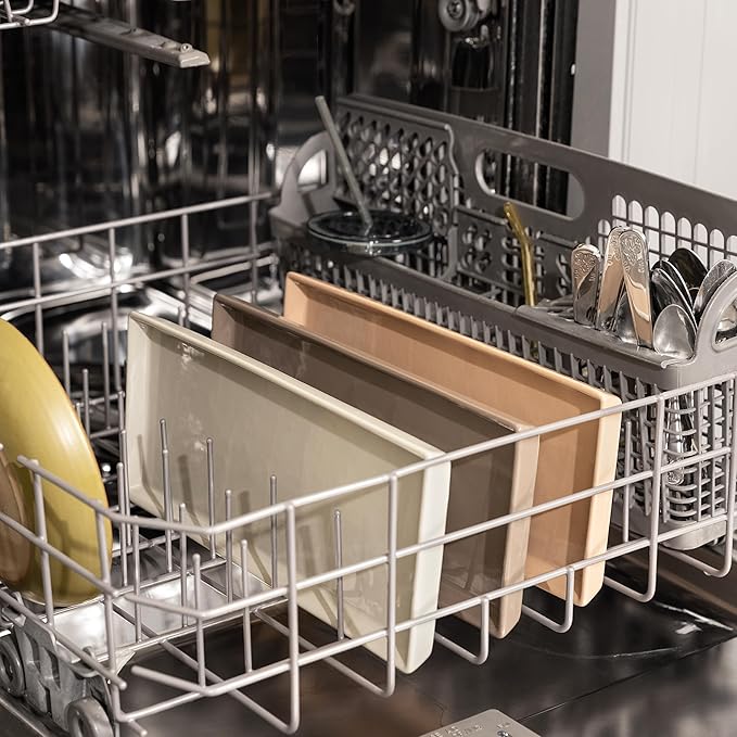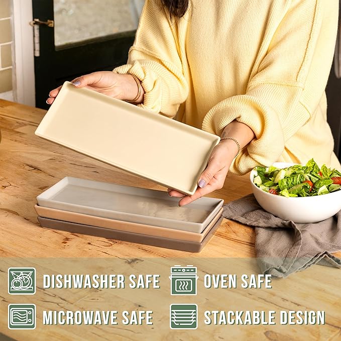 - Set of 4 Ceramic Trays – Uniquely and beautifully designed rectangular ceramic serving trays that are great for any occasion; Beautiful neutral colors will match any of your home’s decor; Each dish is 14” x 6”