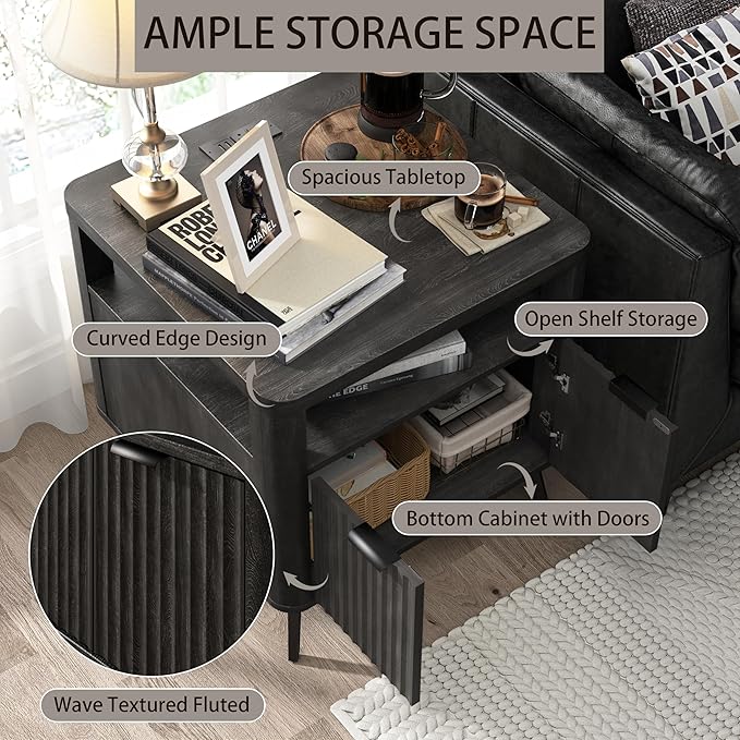 Nightstand with Charging Station, 24" End Table Side Table with Open Shelf, Modern Large Wood Fluted Bedside Cabinet for Bedroom, Living Room, Black